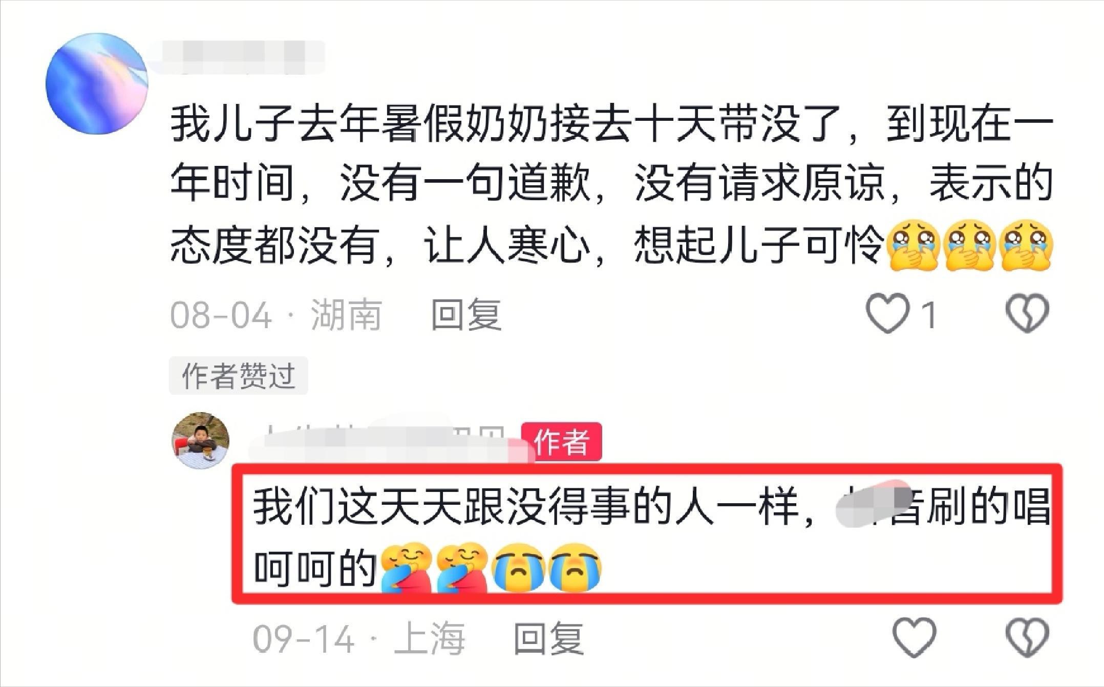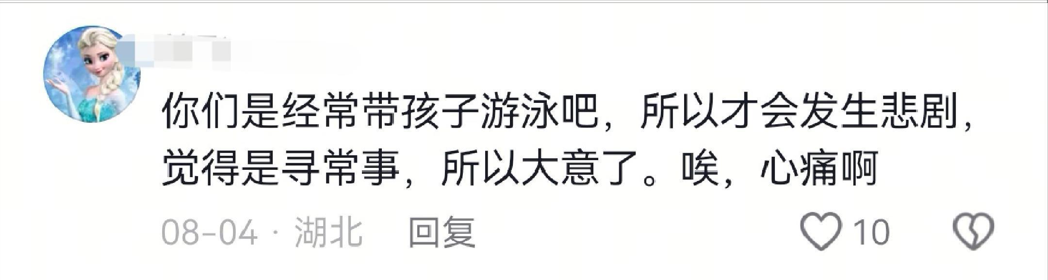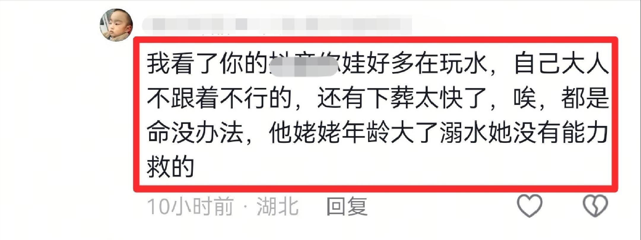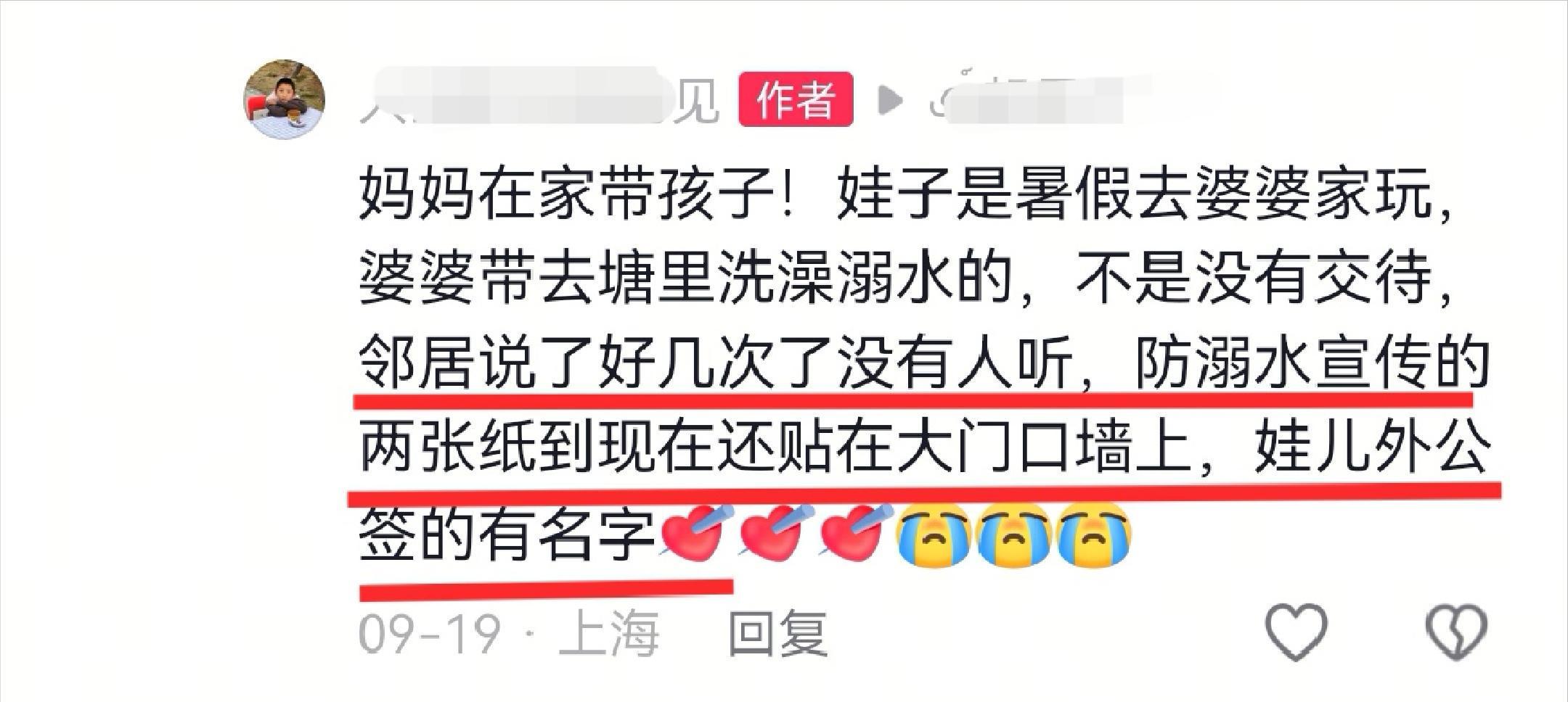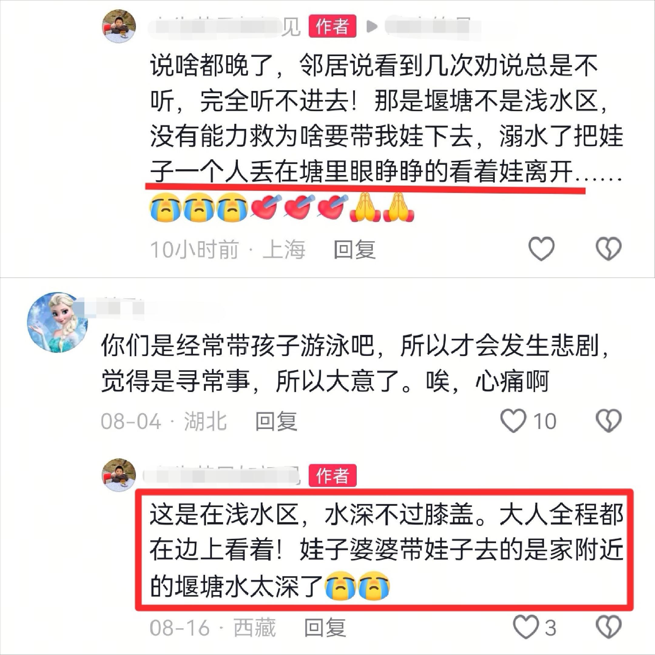 每每提及此事,张先生的情绪都非常激动,他无法接受这个事实,也无法原谅。关于然然溺水的过程,张先生在评论区回应称,他本人曾是一名货运从业人员,常年在外工作。为了照顾儿子,妻子留在了湖北老家,仅在附近上班。但这个暑假,儿子想去外婆家玩,没想到外婆却带娃去池塘游泳了,随后在深水区溺水。外婆解释说没有拉起来,眼睁睁地看着儿子沉入水底。