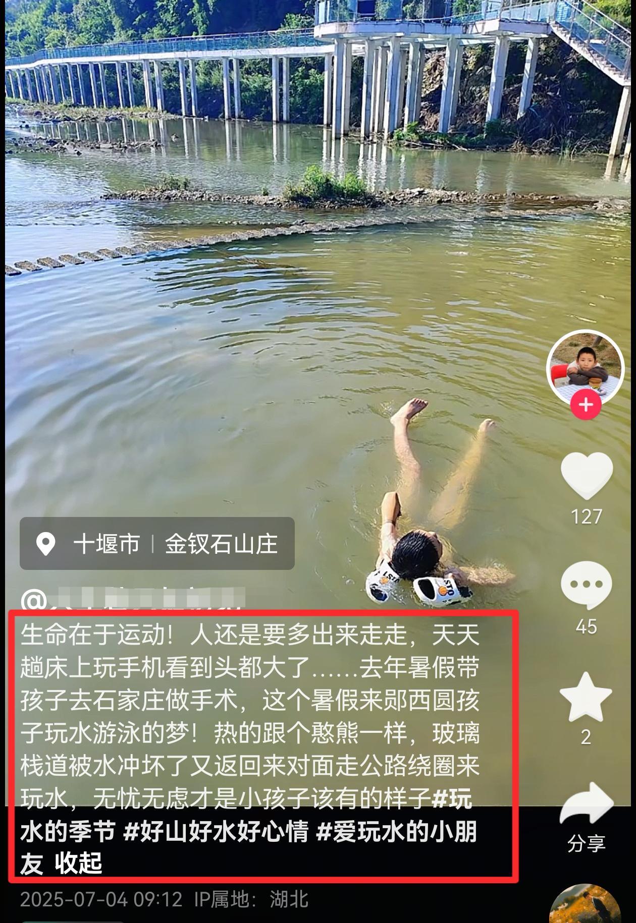 在张先生7月份发布的文案中,称生命在于运动,暑假要带孩子实现玩水的梦,无忧无虑才是孩子该有的样子,而且也确认这个孩子喜欢玩水。但家长都清楚,学校的防溺水宣传可不是这么说的,而是严格杜绝一切户外游泳的行为,不让孩子接触户外水域。