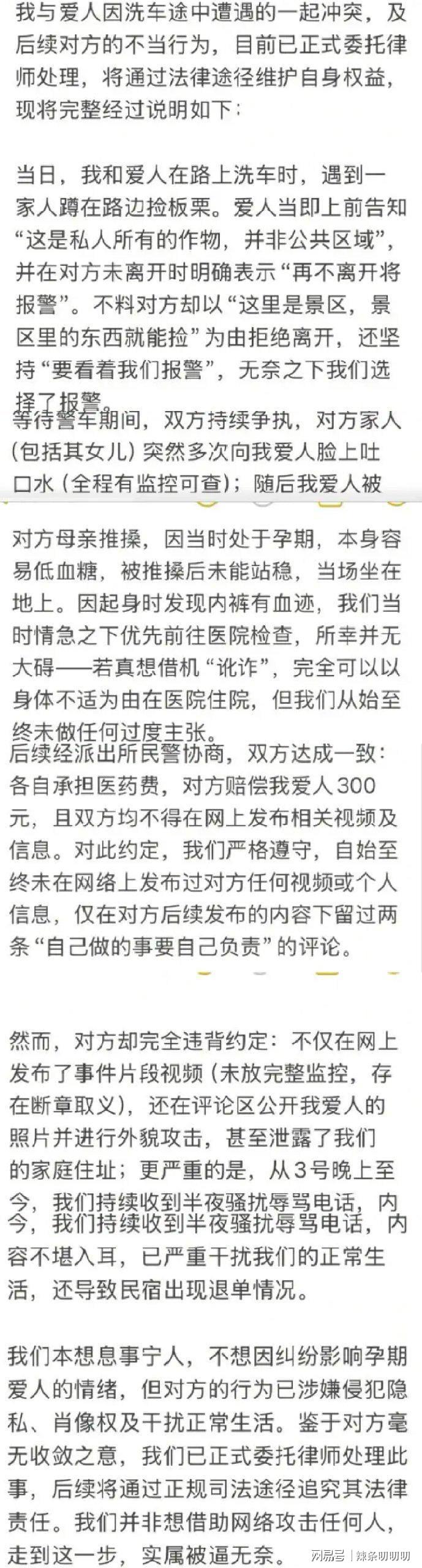 虽然双方已经达成了和解,但在网络上,关于这件事的争议仍然持续不断。民宿老板一方认为,自己的妻子在冲突中受到了伤害,对方给予赔偿是理所应当的。同时,他们还指责对方违背了和解约定,在网上持续发表负面言论,导致自己和家人遭到网暴,民宿生意也受到了严重影响。因此,他们决定找律师起诉游客。