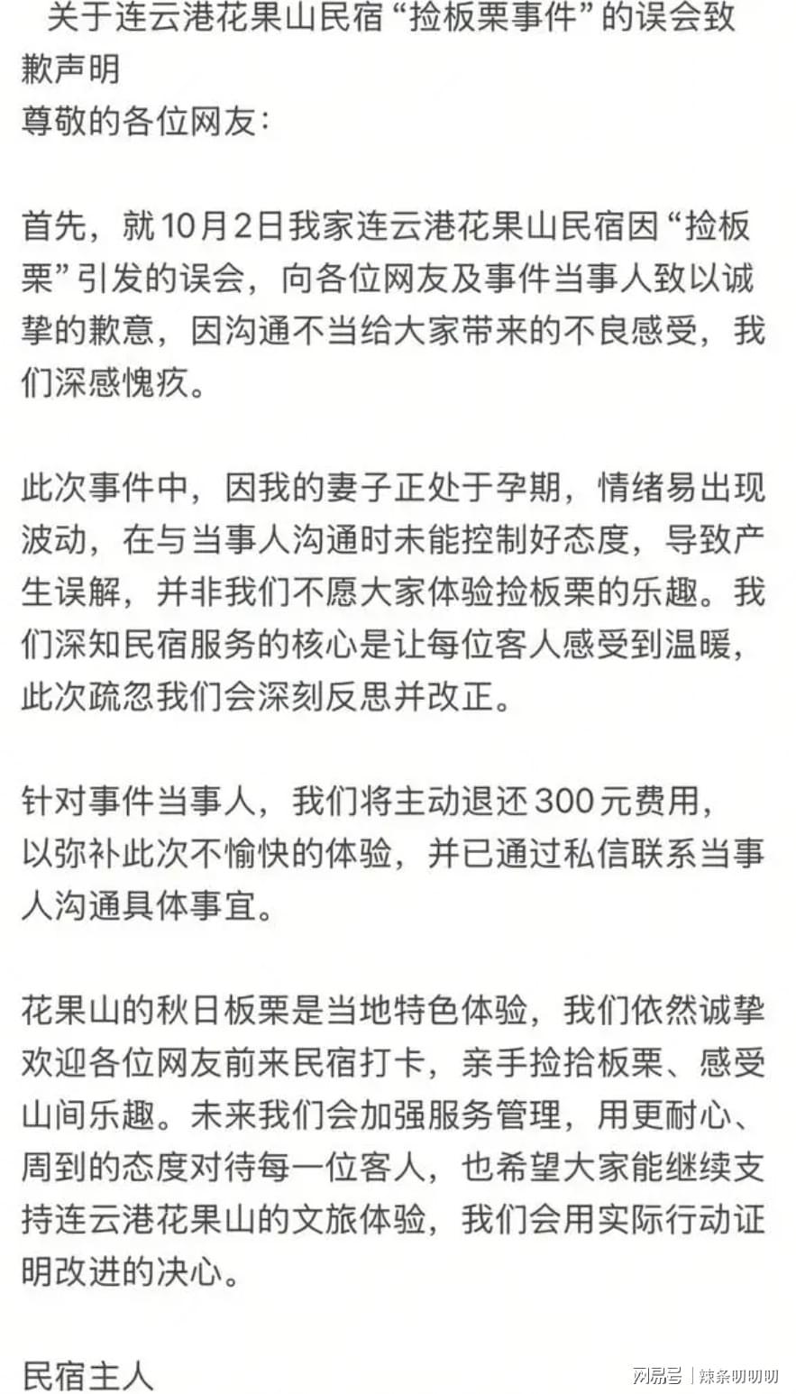 然而,就在事情看似无法挽回之际,却出现了转机。或许是受到了广大网友的批评和压力,民宿老板近日重新发表了声明,向广大网友道歉。他表示,自己是因为沟通不当,加上媳妇在孕期情绪不稳定,才导致了这场风波。最后,他决定退还游客赔偿的300元营养费。