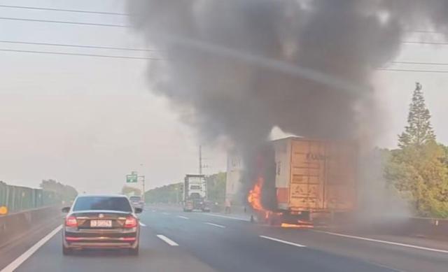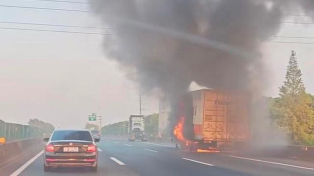 原标题:《半挂货车高速起火 后轮处蹿出明火》