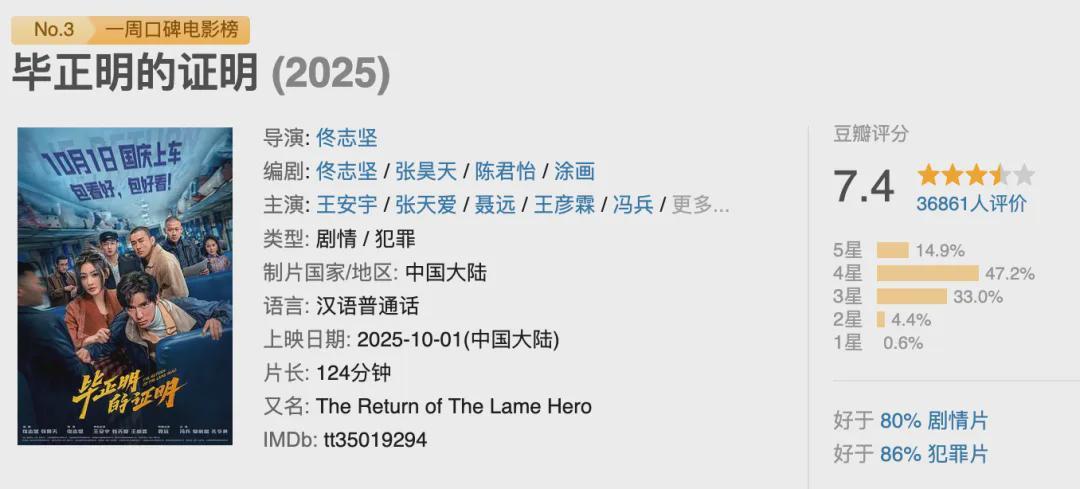 数据显示,今年国庆档票房过亿的新片仅有四部,这一数字与往年相比显得格外寒酸。从观众评价来看,两部口碑较好的影片竟然都是相对小众的作品。其中一部是由王安宇和张天爱主演的犯罪类型片《毕正明的证明》。