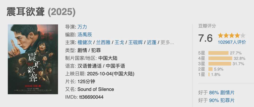 另一部口碑不错的作品是檀健次主演的《震耳欲聋》。这部相对小众的犯罪片同样展现了不俗的可看性,尤其是主演的粉丝号召力为影片带来了一定的票房保障。当然,将这部影片与《我不是药神》相比还为时尚早,两者之间仍存在不小的差距。