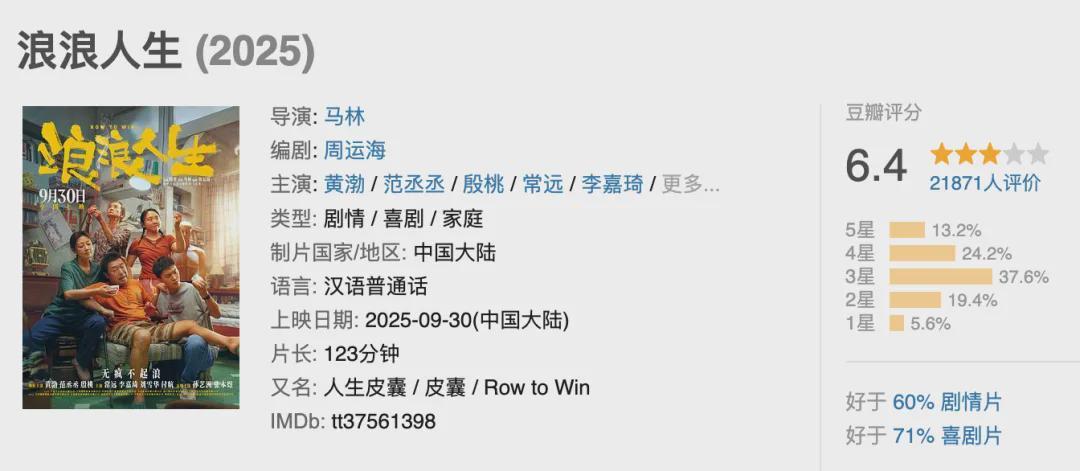 另一部令人遗憾的影片是国庆档唯一一部喜剧片《浪浪人生》。原本以为在喜剧类型稀缺的档期中,这部影片有望成为票房黑马,但实际表现却不尽如人意。一方面,它的票房成绩未能达到黑马水平;另一方面,影片的质量也较为一般。
