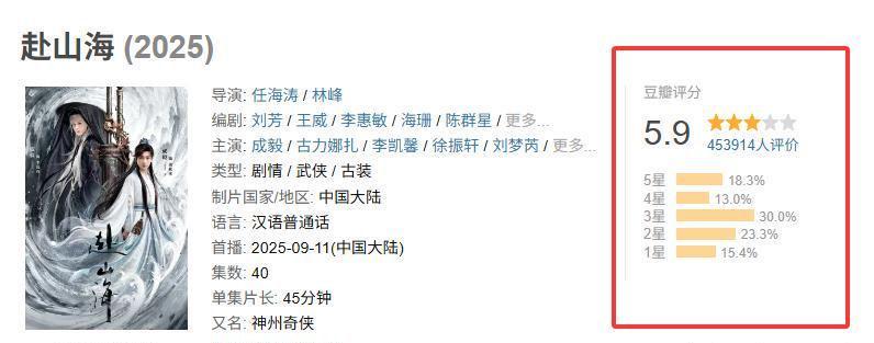 相比之下,流媒体平台在古装剧方面的表现却略显逊色。尽管他们擅长此类题材,但今年以来,已有几部古装剧悄然“扑街”。例如,前期宣传得沸沸扬扬的《赴山海》,开播后却因抠图、演员穿帮等问题而饱受诟病,最终评分定格在5.9分,几乎跌破及格线。