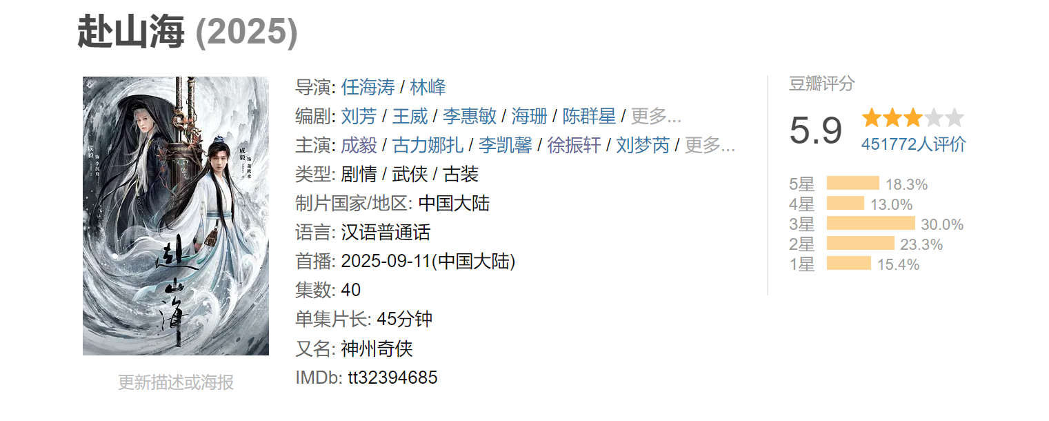 相较于肖战与杨洋的‘逆袭’叙事,成毅的武侠古偶《赴山海》则略显遗憾。自2023年《莲花楼》爆红后,观众对成毅的武侠剧期待值飙升,但《赴山海》却未能延续辉煌。尽管播出前期热度与播放数据亮眼,但口碑崩盘已成事实。