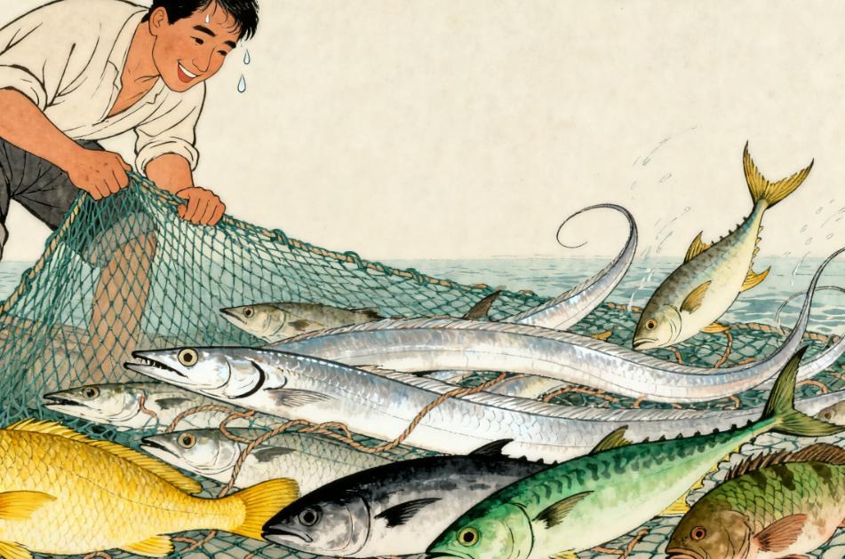 阿海驾着渔船,在海上平稳地行驶着。他撒下渔网,耐心地等待着。没过多久,渔网便有了动静,阿海用力拉起渔网,只见网里装满了大大小小的海鱼,有黄花鱼、带鱼、鲅鱼,还有几条珍贵的石斑鱼。阿海心里高兴极了,心想今天真是个好收成,春桃看到这些鱼,肯定会很开心。
