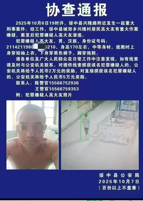 如果您有任何与案件相关的线索或信息,请及时与绥中县公安局联系。您的每一个线索都可能成为破案的关键,让我们携手共同维护社会的和谐与稳定。