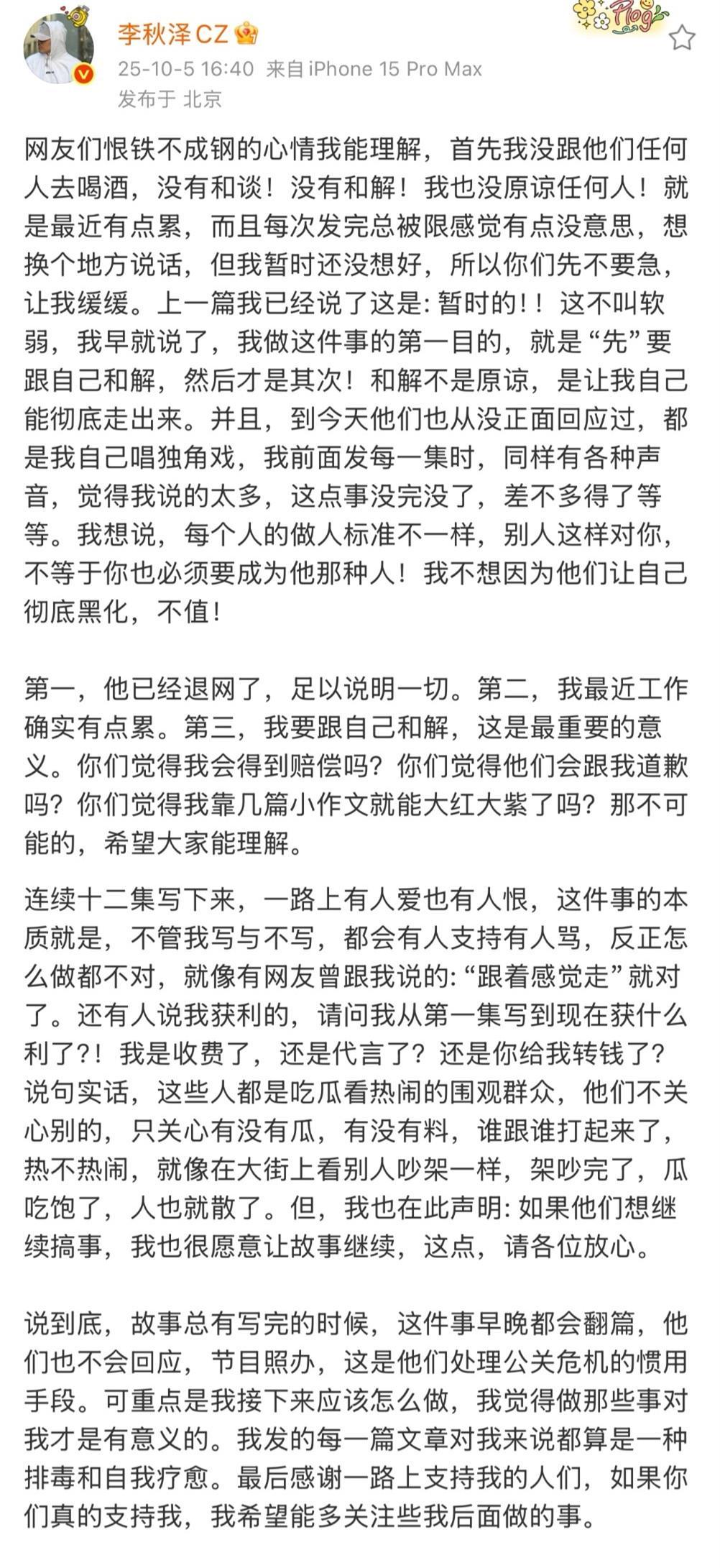 尽管已暂停公开爆料,但仍有网友质疑他与车澈达成和解。对此,李秋泽明确否认:“网友们恨铁不成钢的心情我能理解,但首先我没跟任何人喝酒谈和,更没有和解或原谅任何人。最近只是有点累。”