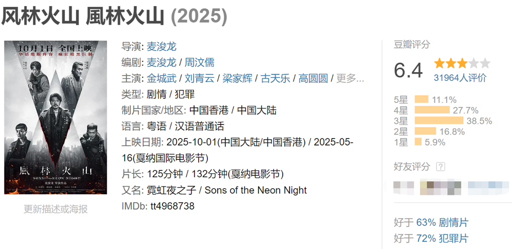 以《风林火山》为例,这部国庆档最“抽象”的电影,集结了金城武、刘青云、梁家辉、古天乐、高圆圆、任贤齐等一众大咖。若按传统港片标准,它本应是档期头部。但实际是,该片前后折腾八年,只为成全导演麦浚龙的个人想法。
