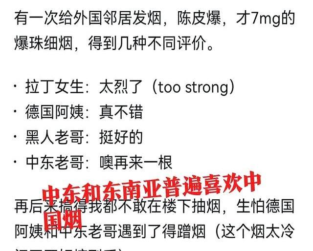 有网友分享说:“在加拿大,老师最会蹭烟了,一见到中华就立马凑上来,嘴上说着健康,手却不停地伸。”另一位网友也附和道:“给老外发根芙蓉王,他们能乐一天,嘴里直说太香了,转头还和同学炫耀自己抽了中国烟。”