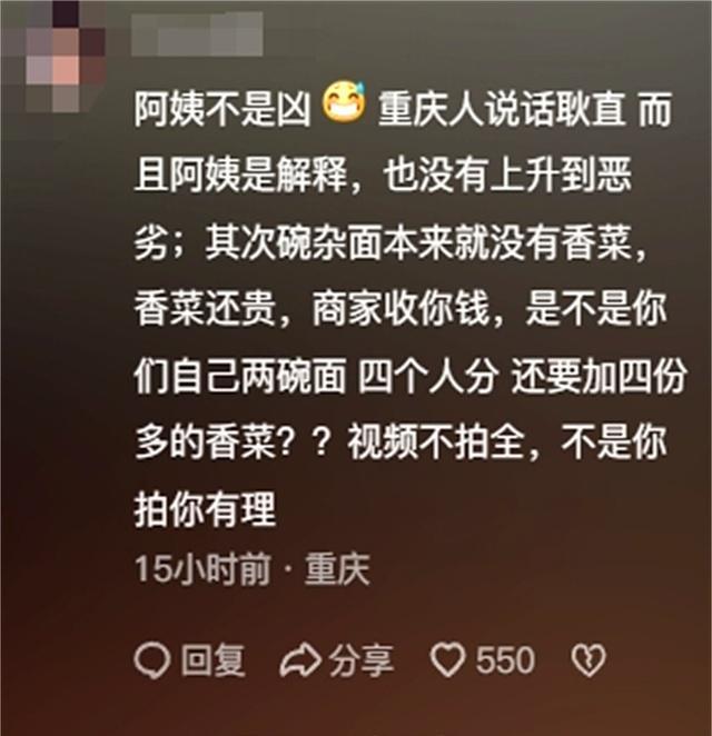 网友对此事看法两极分化。有重庆本地网友表示:"小面馆的调味料都是定量采购,香菜价格是牛肉的三倍,随意添加确实影响经营。"另一位网友则直言:"吃火锅多舀辣椒都不收费,怎么吃面加香菜就要钱?这种曝光方式太不理智。"