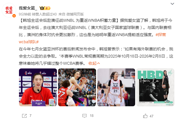 国内媒体人“我爱女篮”也报道称,韩旭将在全运会后前往澳大利亚征战WNBL,这一决定也是为她明年重返WNBA提前适应高强度比赛。