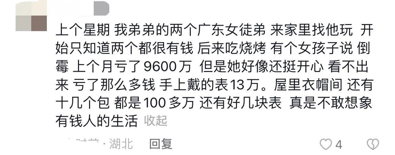 还有位认识的姐姐,让网友陪她去逛街,说要给她儿子买一个20岁生日的礼物。结果她全款买了一套2000多万的大平层,还说反正也是前两天股市赚的。这随手一赚,就是网友一辈子的钱啊!