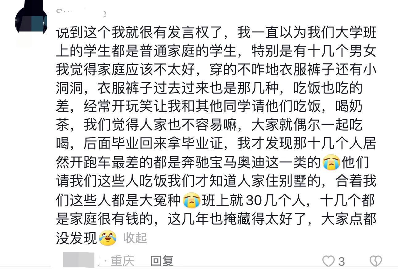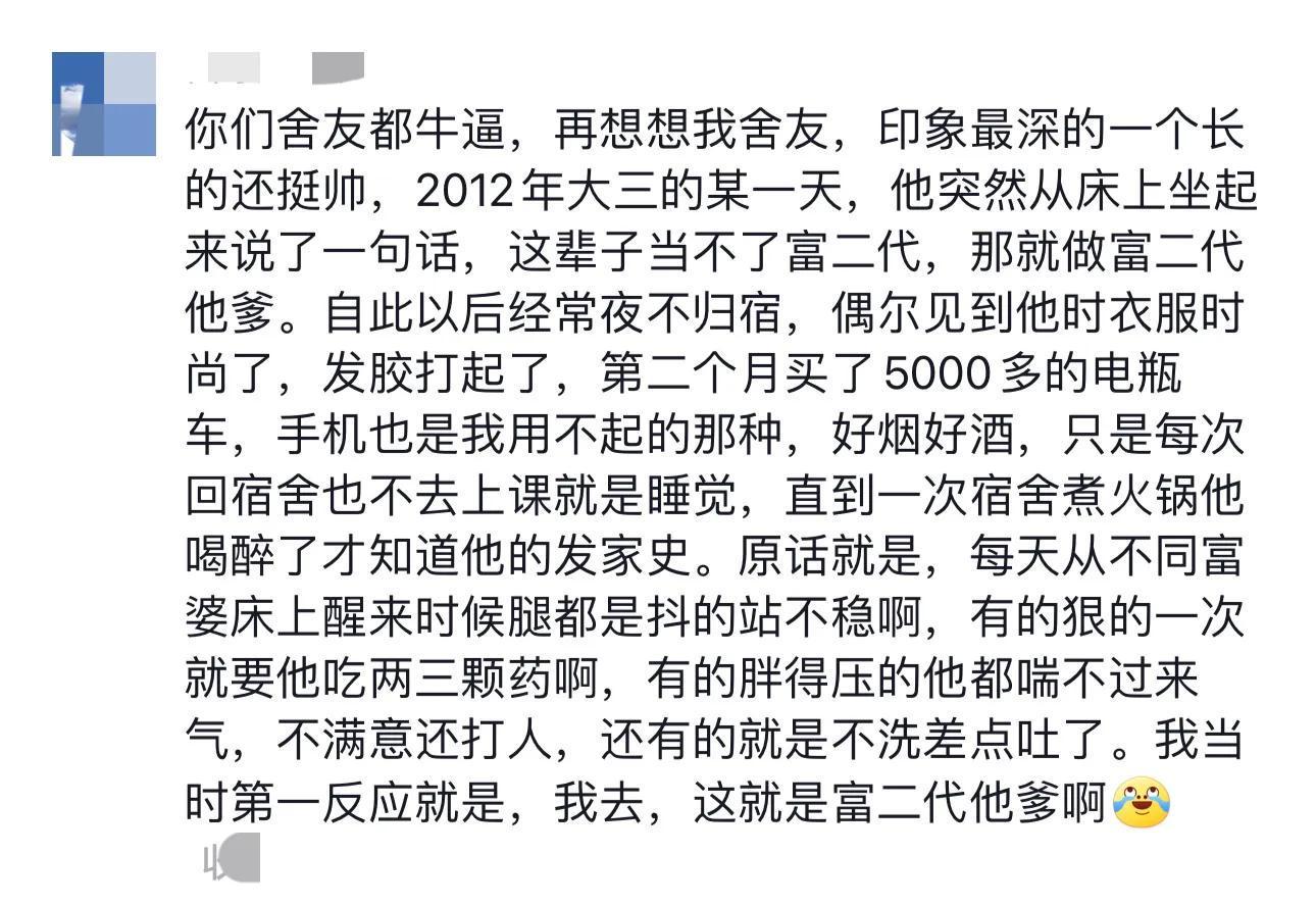 有网友分享说,大学时有个室友,是校长的侄女,这本身并不稀奇,因为自己也是博导的女儿,这个寝室仿佛就是为她们准备的。但令人惊讶的是,这位室友高考才400多分,而她们系的录取线可是600多分。后来才知道,她大伯是如何“操作”的。再后来,她爸爸来访,网友发现竟是深圳那边新闻上常出现的人物。聊天中更得知,她家里还有游艇。不久后,她就通过联校项目去了美国,还嫁入了那边别墅院子里带高尔夫球场的香港几代移民的豪门。