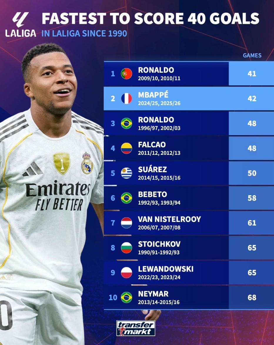 德转的详细统计显示,姆巴佩的42场40球效率不仅远超同时代前锋,更在近35年西甲历史中位列第二。排名榜首的是C罗在2009-11赛季创造的41场40球神迹,而巴西传奇罗纳尔多则以48场40球位居第三。此外,法尔考、苏亚雷斯等顶级射手均需更多场次才能达成相同目标。