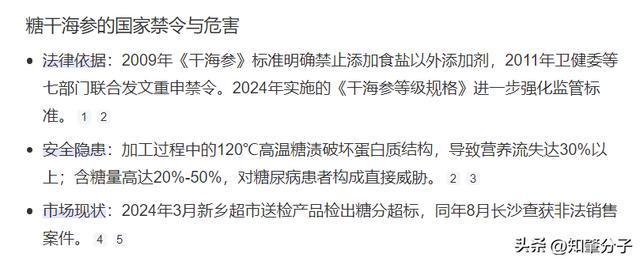 值得一提的是,2009年《干海参》标准明确禁止添加食盐以外的添加剂,2011年卫健委等七部门联合发文重申禁令。2024年实施的《干海参等级规格》进一步强化了监管标准。也就是说,“糖干海参”已经被国家明确禁止,不应该在市场上售卖。