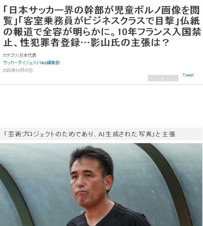 据日本媒体《足球文摘网》最新报道,北京时间10月7日,日本足协正式宣布,免去影山雅永技术委员长的职务。这一决定源于其在飞往法国巴黎的航班上,因观看儿童色情图片被法国警方查处,最终被判处18个月缓刑监禁,并被罚款5000欧元。