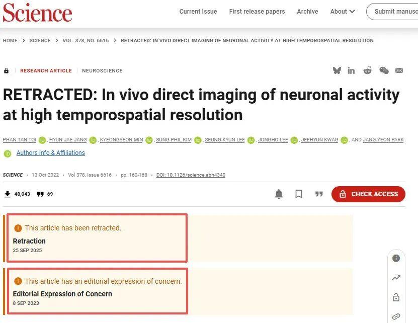 事件追溯至2022年10月13日,朴昌源副教授(成均馆大学)与首尔国立大学大脑与认知工程系吉永英教授作为联合通讯作者,在《Science》期刊发表题为'In vivo direct imaging of neuronal activity at high temporospatial resolution'的研究论文。该成果宣称实现脑神经活动的高时空分辨率直接成像,被视为脑科学领域的重大突破。