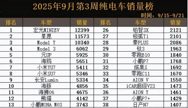 9月份第三周的纯电车型销量数据新鲜出炉,数据显示,宏光miniEV、吉利星源分别占据前两名,而第三名则是特斯拉的Model Y。这三款车型也是当周销量破万的车型,其中Model Y的周销量达到了1.034万辆。