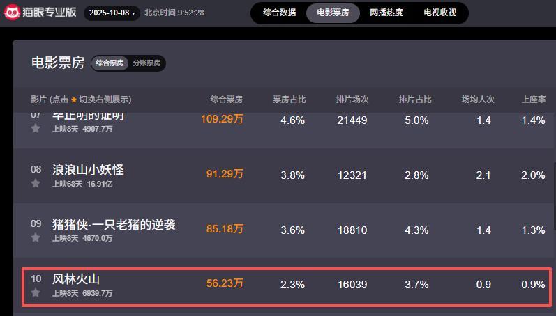 排片占比为 3.9%,票房占比仅 2.8%,上座率更是同期新片垫底。