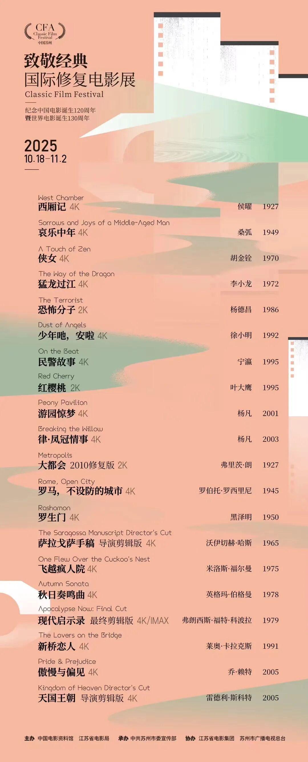 2025第六届“致敬经典·国际修复电影展”将于10月18日至11月2日在苏州盛大启幕,这场以“修复时光,致敬经典”为主题的光影盛宴,明日将正式公布完整排片信息。作为江南文化的重要载体,本届影展特别策划了“最苏州”的观影体验,让观众在园林、昆曲与电影的交融中感受独特的文化魅力。