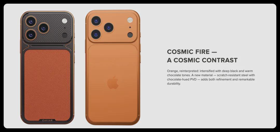 整体来看,这套定制款iPhone 17系列在原有配色基础上进行了重新设计,移除了铝金属材质,转而采用不锈钢中框,这一改动赢得了不少用户的好评。首先登场的是iPhone 17 Pro系列的橙色款定制版,名为“Cosmic Fire”(宇宙之火)。机身背部采用棕色金属搭配爱马仕小牛皮材质,延续了新机的拼接设计,同时中框还加入了亮面处理,尽显奢华。
