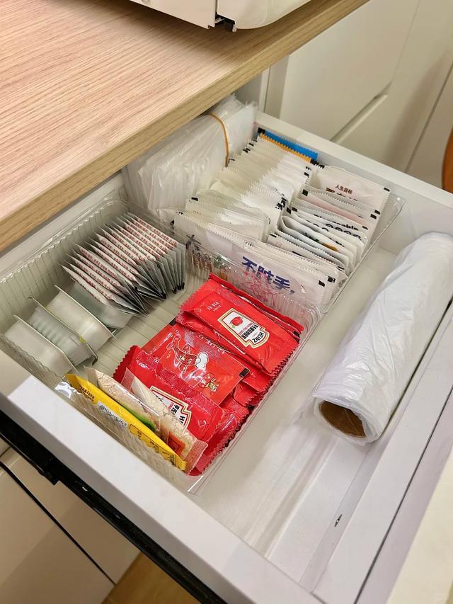 抽屉里的小东西最容易乱,一次性手套,番茄酱,皮筋,化妆品小样等等,堆在一起,每次找个东西都得翻半天。