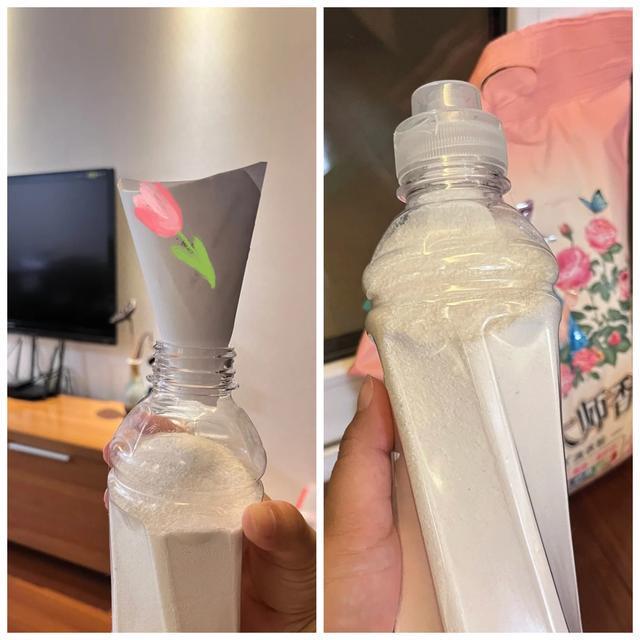 老妈发现用尖叫瓶来分装洗衣粉非常好用,灌装洗衣粉时,把瓶盖拧下来,用废纸卷个漏斗就能装进去,简单粗暴。