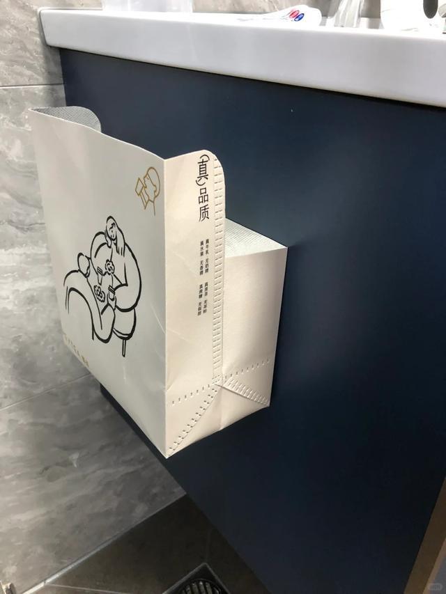 老妈的思路很简单:奶茶袋子别扔,剪成前高后低的形状,贴在洗手台旁边。