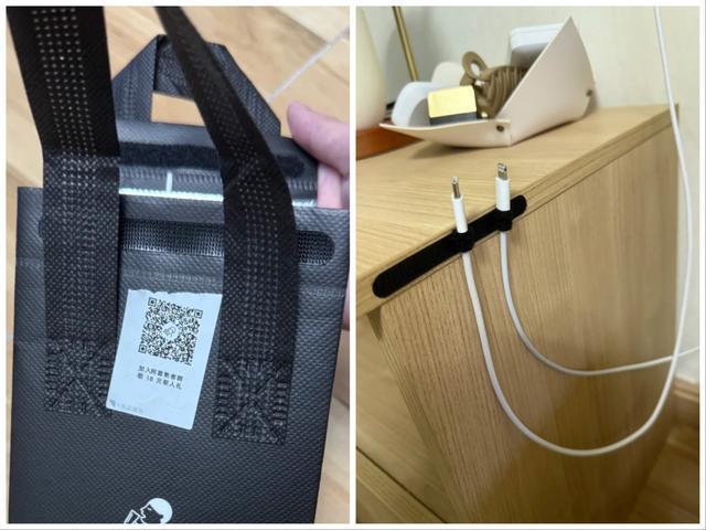 老妈看到我喝喜茶的外卖袋上有魔术贴,灵机一动,把魔术贴撕下来分别粘在床头柜和充电线上。