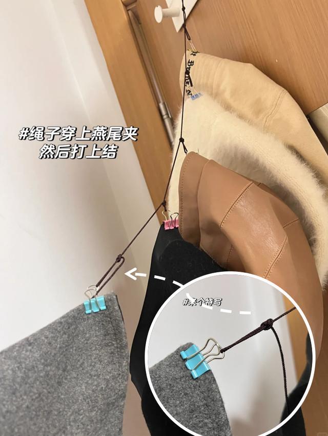 方法也很简单:一根绳子+几个燕尾夹搞定。绳子穿过燕尾夹然后打个结,如图。