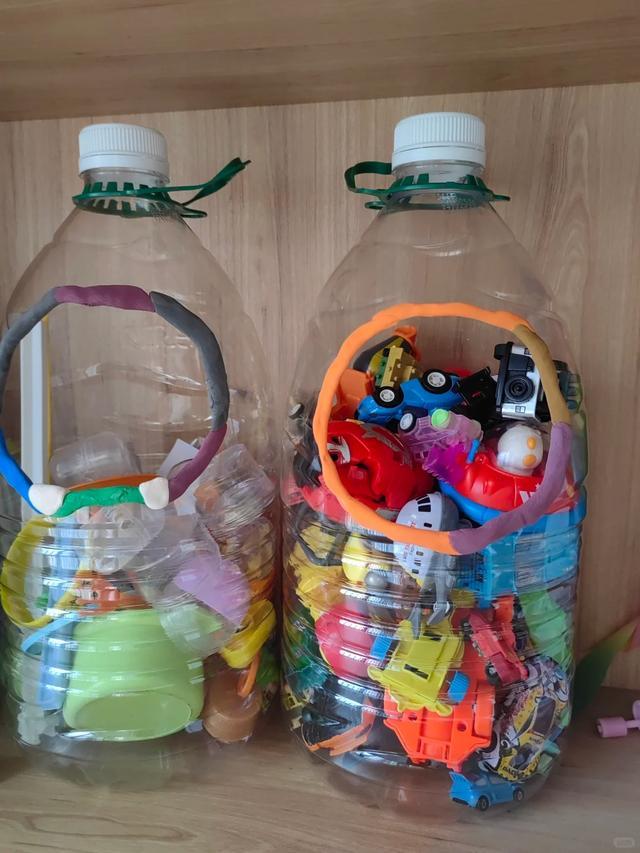 老妈的办法特别实用:把大号矿泉水瓶割个口子,用超轻粘土把毛边封起来防刮伤,收纳小孩的玩具。