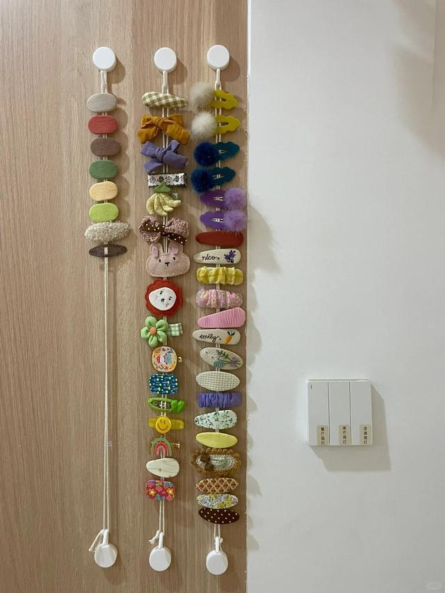 老妈直接用两个挂钩+一根绳子搞定,把发夹一个个夹在上面。