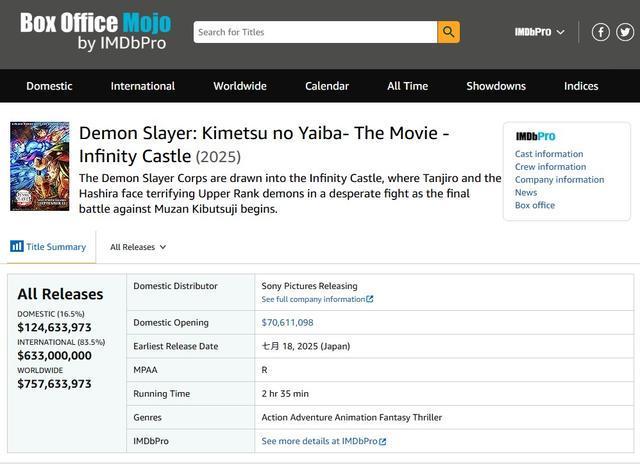 [根据「Box Office Mojo」统计,《鬼灭之刃无限城篇》全球票房破7亿美元,2025年度全球票房第5名。(图/翻摄自网路)