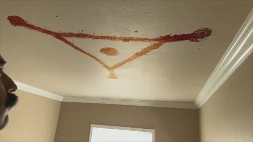 在杀了一家三口之后,他至少在现场又逗留了两个小时,用来完成他在天花板上的图案大作。