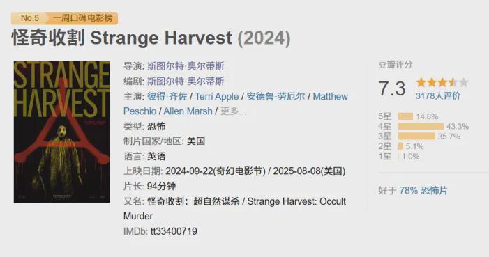 截至目前,《怪奇收割》在一向不看好恐怖片的豆瓣上获得了7.3分的高分。