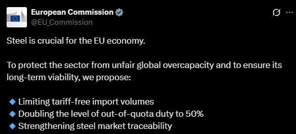 根据欧盟委员会网站发布的消息,该委员会提出了一项提案,具体包含三项措施:一是将免关税钢铁进口量限制在每年1830万吨,较2024年配额减少47%;二是将配额外关税水平提高一倍至50%;三是引入熔化和浇注要求,以加强钢铁市场的可追溯性,防止规避行为。