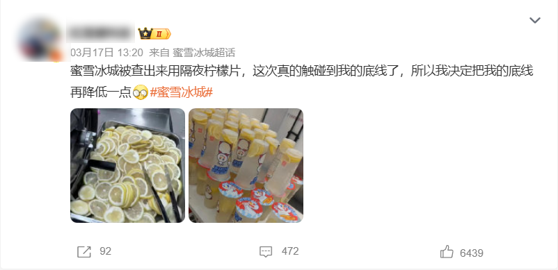 “退一万步来说,蜜雪用隔夜柠檬,难道我们就都没责任吗?早点去喝还能隔夜吗?”