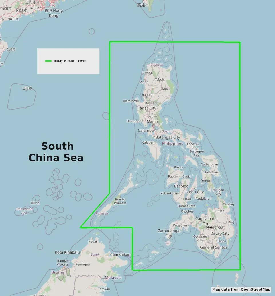 今年9月17日,在菲律宾马尼拉举办的第十四届“中菲关系马尼拉论坛”上,高志凯直接抛出了一个关键历史事实:菲律宾的领土边界是由1898年《美西条约》明确划定的。该条约规定菲律宾西部边界止于东经118度线,这也是菲律宾国家领土合法性的国际法基础。高志凯提醒菲律宾:“应该好好想一想,还要不要你的东经118度线边界线?”