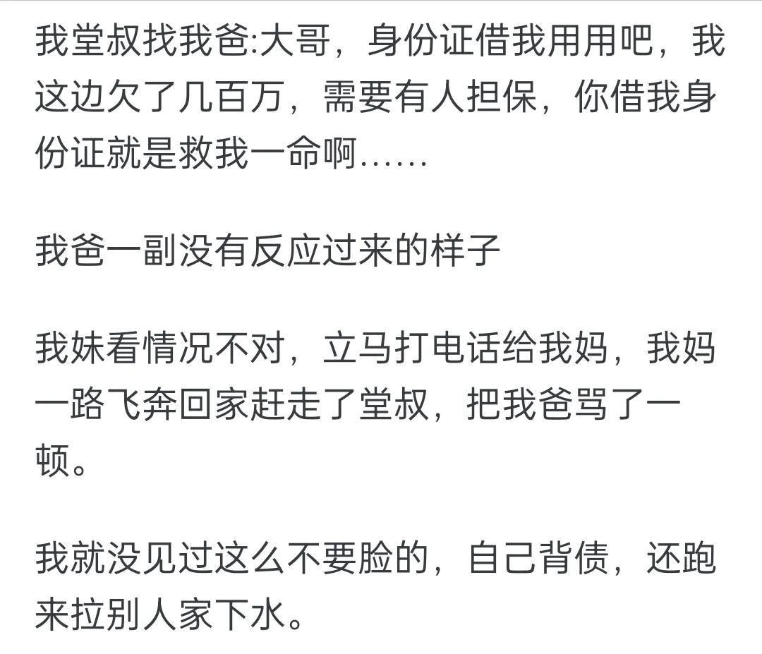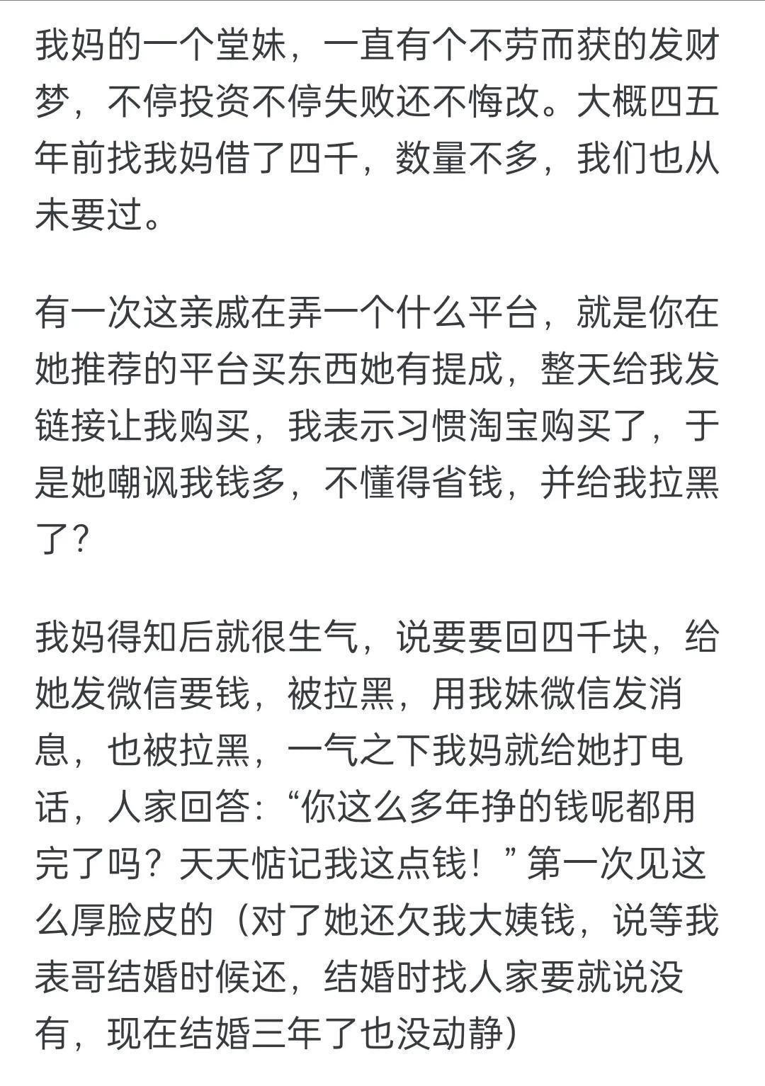 借钱不还的情况也屡见不鲜。有网友表示,自己的舅舅借了妈妈两千块十年了,从来没说还,每年过年来做客还好酒好菜伺候。和其他亲戚抱怨他不还钱,人家竟然回一句“凭本事借的为什么要还”。这种“借钱不还还理直气壮”的态度,真是让人气愤不已。