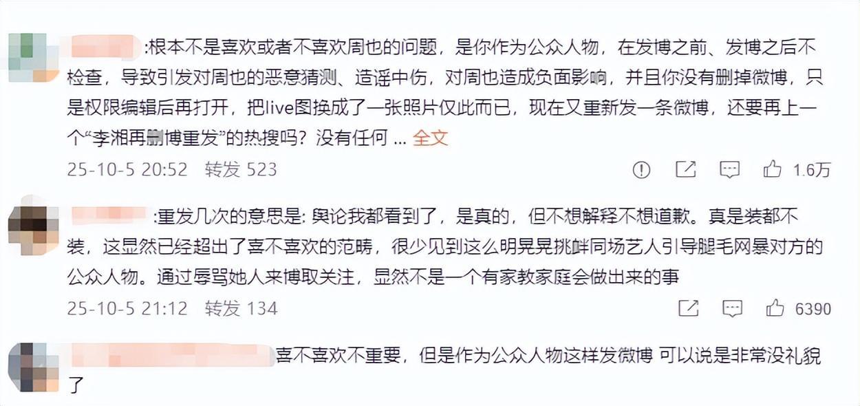4. 面对女儿遭受的网络攻击,李湘未作回应,仅悄然删除原始动态,未曾留下任何澄清或说明。