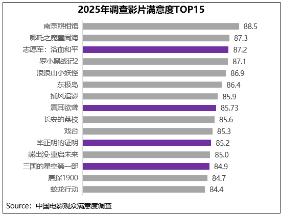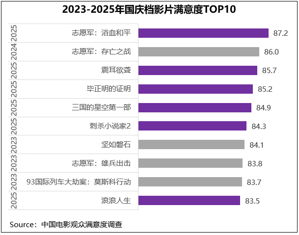 根据中国电影观众满意度调查·2025年国庆档专项数据显示,本年度国庆档电影观众满意度得分达85.4分,较去年同期增长2.1分,创下近四年最高纪录,在历史调查的11个国庆档中位列第四。档期影片涵盖战争、剧情、动画、奇幻、喜剧等多元类型,充分满足观众假期观影需求。在调查的7部重点影片中,3部作品满意度超过85分,其中战争题材影片《志愿军:浴血和平》以87.2分领跑,剧情片《震耳欲聋》和《毕正明的证明》分别位居第二、第三。