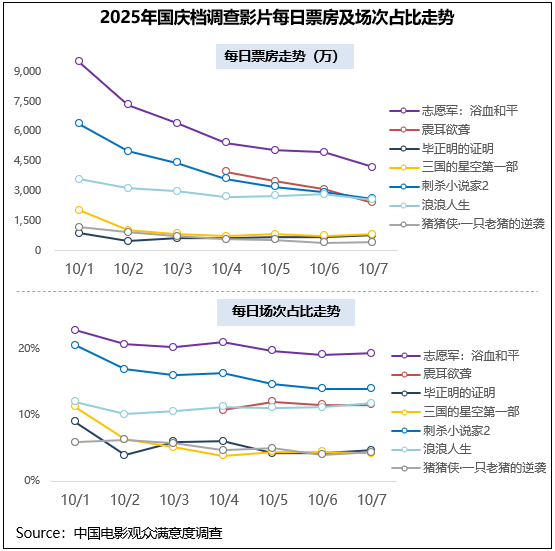 从满意度数据可见,2025年国庆档观众对影片创作质量给予充分肯定,但档期整体观影氛围未达预期。单片表现呈现显著差异,票房走势与口碑关联性增强。《志愿军:浴血和平》凭借稳健表现持续领跑票房和排片榜。《震耳欲聋》在高口碑支撑下,上映前三日票房稳居次席。《毕正明的证明》虽满意度位居第三,但受题材传统、宣传力度不足等因素影响,日票房长期处于后两位,不过仍实现连续5日逆跌。