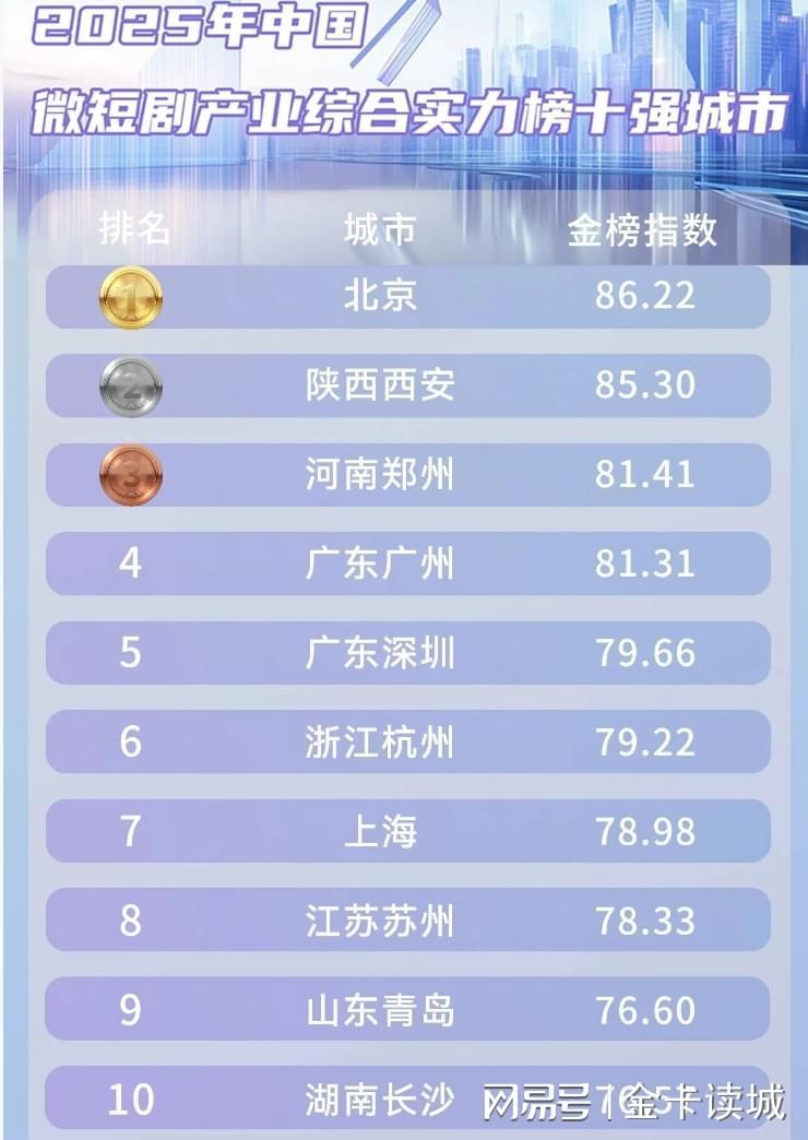 从吃流量的网络快消品升级为数字文娱产业的重要细分赛道,微短剧正成为众多城市的竞争焦点,专业机构评出的微短剧产业十强从高到低分别是北京、西安、郑州、广州、深圳、杭州、上海、苏州、青岛和长沙。