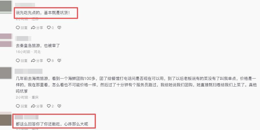 这段视频一发布,很快就被大量网友看到,引发了巨大的舆论。评论区里不少人都分享了自己旅游时被“宰”的经历,有人表示自己一千多吃了一条鱼,问题的关键就是商家刻意隐瞒信息。