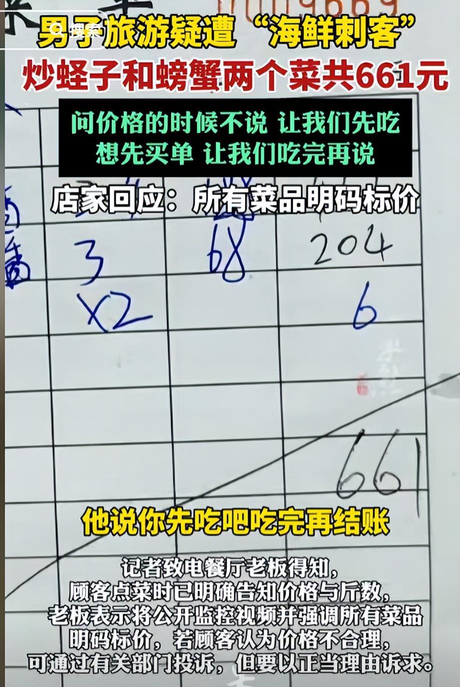 一盘炒蛏子加两只螃蟹,总价居然要661元。杨先生认为自己在吃饭时遭遇了海鲜“刺客”,于是将这段经历拍成视频发到了社交平台。