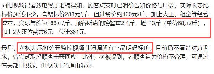 老板表示,杨先生点餐时,店员不仅明确说了每种海鲜的单价,还当场称重并告知了具体重量,不存在“问价不答”的情况。甚至提到,店里实际收费比标价还要低,菜单上膏蟹标注的是288元/斤。