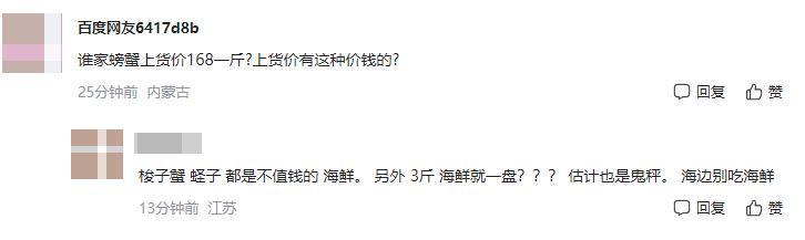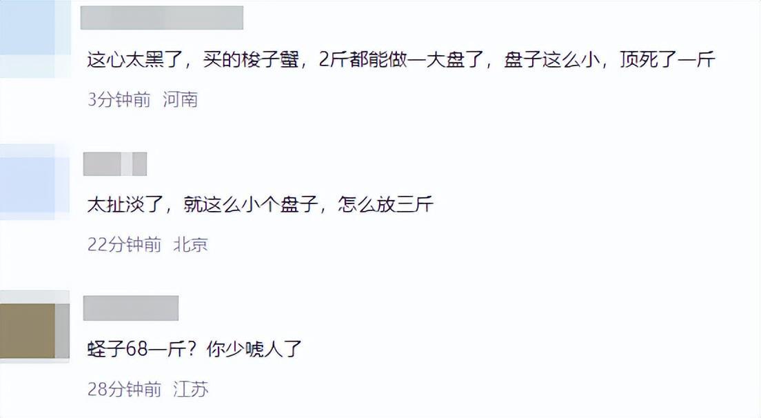 不过网友却表示这菜价可一点都不低,认为这梭子蟹和蛏子其实都不怎么值钱,提出了哪有螃蟹168一斤的疑问。