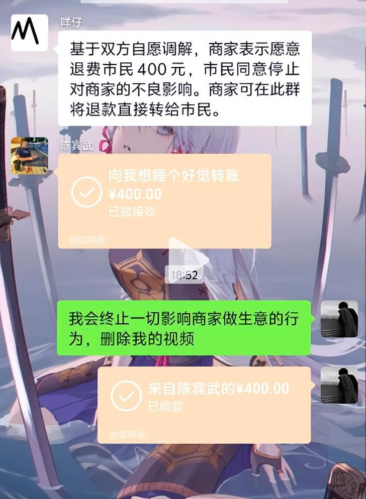杨先生在社交平台发布了后续回应,称经过调解,涉事店家已经向他退还了400元,双方达成了和解。按照和解约定,杨先生会删除之前发布的相关视频,不再发表任何可能影响店家经营的言论,而店家则通过调解群直接完成了退款转账。
